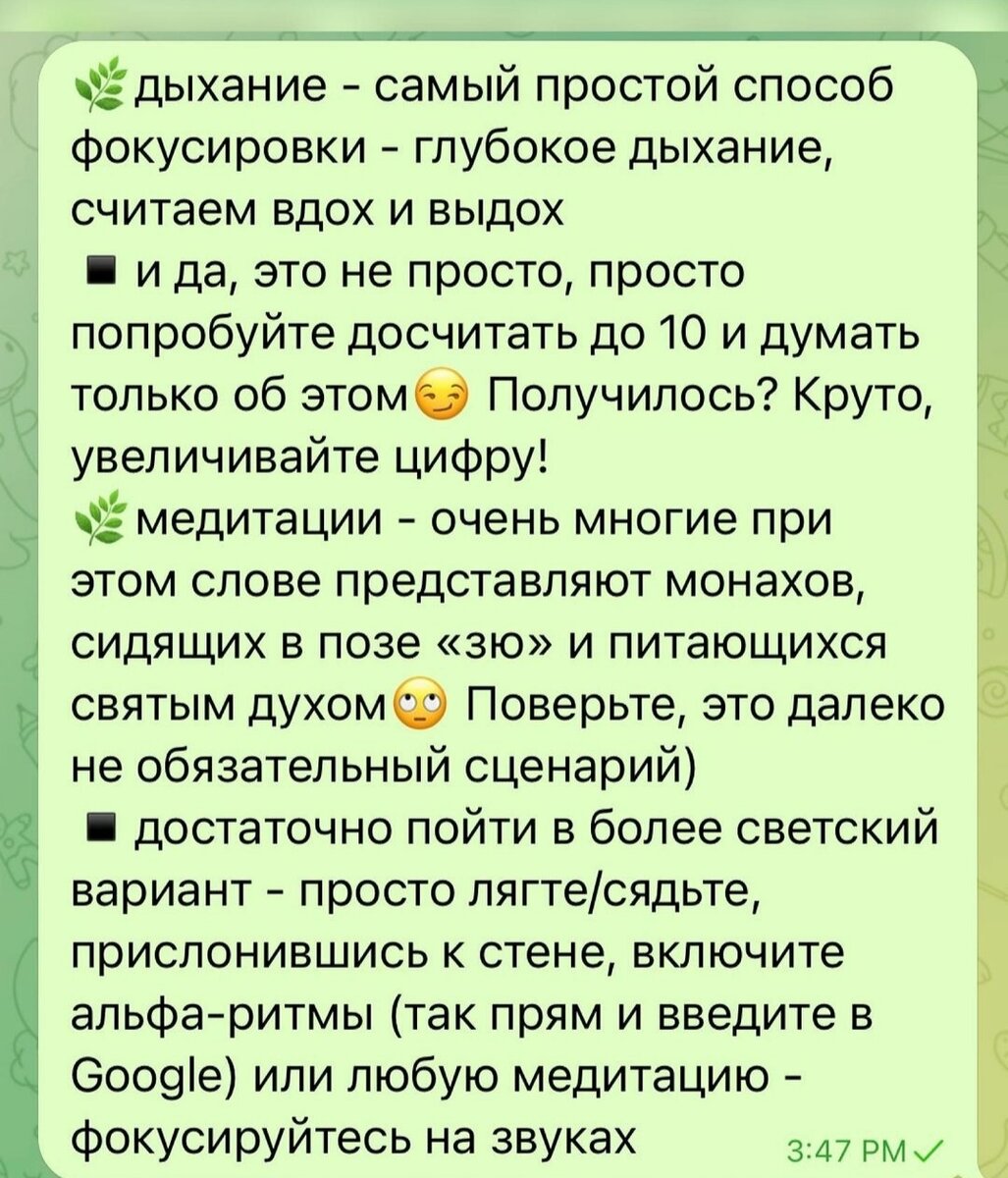 Осознанность - способность отслеживать текущие мысли, чувства, переживания, фокусироваться на том, что происходит в настоящий момент, не вовлекаясь в мысли о событиях прошлого или будущего 🤔Важнейший навык для нашего супер скоростного мира и неотъемлемвй атрибут настоящего лидера 😎 Зачем нужно? 🔸чтобы держать фокус и не распыляться на задачи - мухи 🔸чтоб слушать и главное слышать себя - реагировать, если чувствуете тревогу - задать себе вопросы :"я чувствую это, что это для меня значит ? Почему? " 🔸чтобы иметь возможность фокусировать свою команду С чего же начать? 🤔 Написала 4 простых инструмента, которые помогут вам сформировать эту привычку - листаем фото➡️ Конечно, после одной такой практики или медитации никакого волшебства не произойдёт... Более того, возможно, что другие мысли будут постоянно прерывать вас/ сбивать с толку - не переживайте , просто начните сначала ☺🙏 Закончу этот пост одним очень понравившимся мне высказыванием:"если у вас нет времени медитировать 1 час