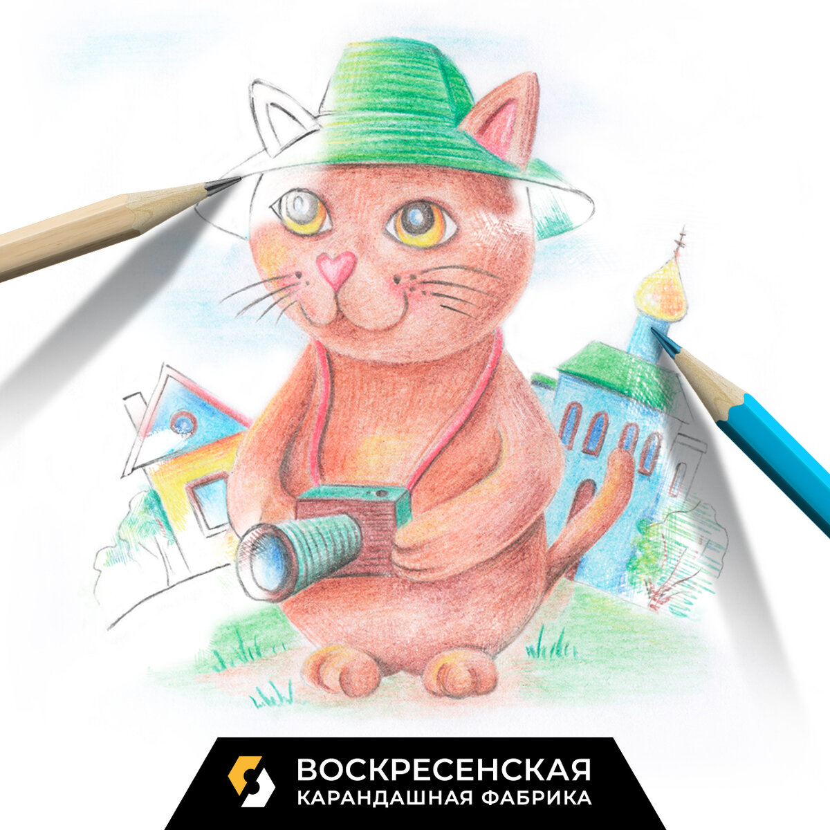 Любите ли Вы путешествовать так, как это любит наш кот Василий?! Вспомните ваши самые яркие путешествия, большие и маленькие, дальние поездки или в соседнюю область, согрейтесь воспоминаниями. Представьте, куда бы Вы хотели отправиться снова! А мы к Всемирному дню туризма предлагаем нарисовать яркую тематическую картинку по пошаговому мастер-классу от Воскресенской карандашной фабрики. Насладитесь процессом рисования цветными карандашами серии Живопись! Этапы работы: 1. Перед началом работы, следует подготовить материалы: графитный карандаш "ВКФ" "ИНЖЕНЕР" 1-1240 с градацией твердости ТМ (HB), набор цветных шестигранных карандашей "ВКФ" "Живопись" JIV-CP-1024 24 цв., ластик, лист бумаги. Намечаем расположение основных объектов: овальную голову котика (делим ее дугой на две части), ниже намечаем туловище, лапки, фотоаппарат. Полукругом рисуем линию горизонта, на нее помещаем домик, церковь и деревья. 2. Рисуем котику шляпку с прорезями для ушек. На дуге, которой мы делили мордо