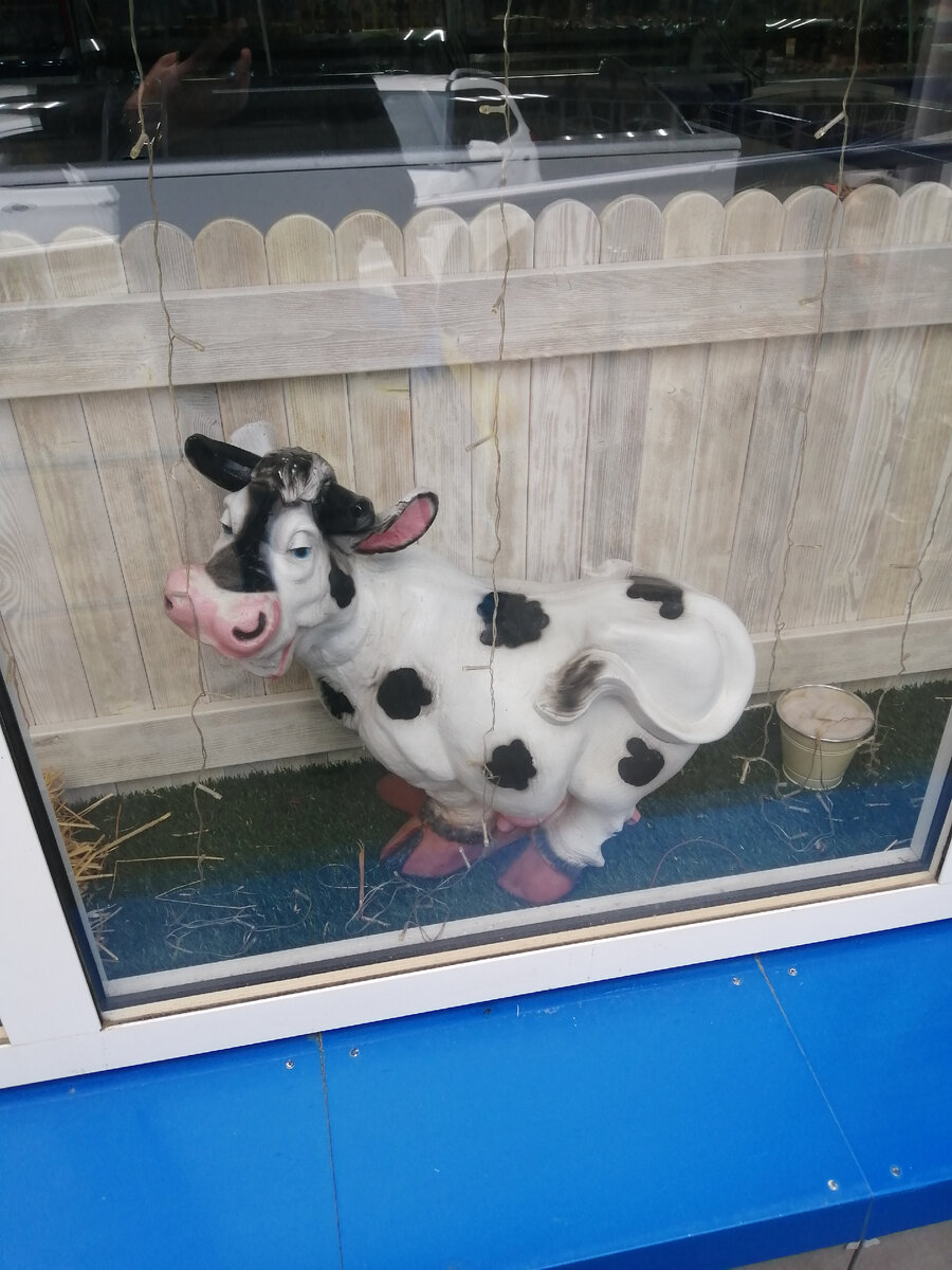Добрый день дорогие друзья. Хочу поделится с вами смешным случаем который произошёл с нами буквально вчера. У нас в городе есть молочный комбинат и его символы коровы Украшают не только территорию возле предприятия но и магазины. Один такой под названием гигантская корова и весящий 24 тонны стоит возле одного из магазинов. Так же коровы есть на крыше, В виде лавочек, Стоят в магазинах И на витринах В общем у нас их привеликое множество!😊. И вот идём мы с Ченькой мимо такого магазина и вдруг..... Он как кинется с лаем! Я аж опешила. Сначала решила что кошка. Но хвостатой не было и в помине. А Ченька все рвался с лаем к...... витрине! В которой стояла вот эта самая корова! Охотник блин! С трудом успокоила. Пришлось подойти к витрине и показать что она не живая. 🤣🤣🤣 Мне вот интересно как бы он себя повёл если бы увидел настоящую живую корову? 🤔 Лошадей мы видели - пони и обычных. Немного полаяли и все. Мы им не интересны они нам. Верблюд тоже не вызвал особых эмоций. А вот ко