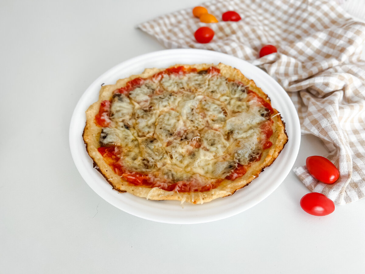 КБЖУ на 100 грамм: ~ 270кал; белки-36г; жиры-11г; углеводы-4г. Пицца, одно из любимых блюдо многих, но из-за высокой калорийности мы часто отказываемы себе в этой вкусности. Но теперь это не проблема, благодаря рецепту высокобелковой пиццы, теперь ее можно кушать даже на ужин, поэтому скорее ставь чайник и давай готовить. Ингредиенты: Филе куриное-250г; Лук- 1/4 луковицы; Грибы-80г; Чеснок- две дольки; Помидор-1шт; Сыр 16%-100г; Яйцо-1шт; Масло оливковое-1ч.л; Соль, перец по вкусу. Первым делом приготовим соус, для этого измельчаем помидор, натираем чеснок и отправляем все на разогретую сковороду с каплей масла. Солим и перчим заготовку, тушим под крышкой на среднем огне до полного приготовления. Пока готовится соус, нарезаем слайсами шампиньоны, обжариваем на сковороде с каплей масла, добавляем немного воды и тушим под крышкой, на средней температуре до готовности. Когда грибы будут готовы, солим, перчим, так же можно добавить сушеный чеснок или любые другие приправы на ваш