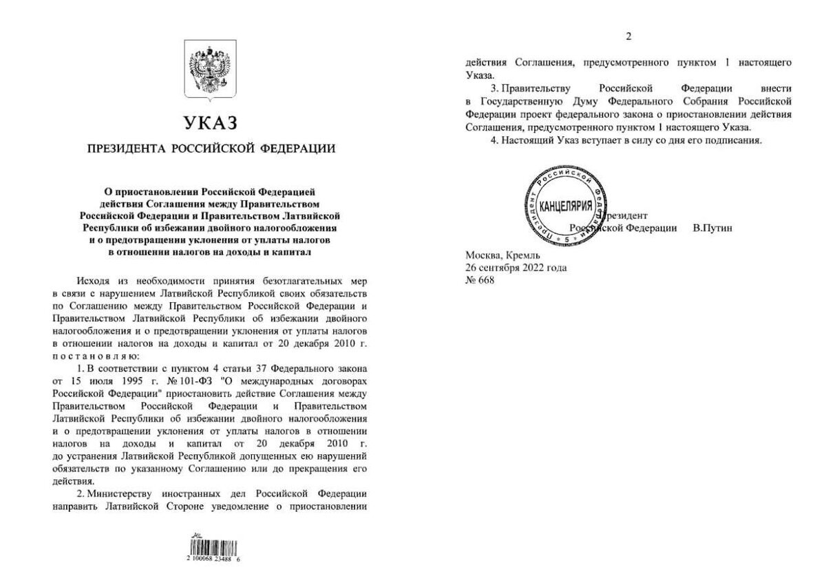 Документ вступает в силу со дня подписания. РФ приостанавливает действие соглашения с Латвией об избежании двойного налогообложения, соответствующий указ подписал президент России Владимир Путин. Документ вступает в силу с сегодняшнего дня. «Приостановить действие соглашения между правительством РФ и правительством Латвийской Республики об избежании двойного налогообложения и о предотвращении уклонения от уплаты налогов в отношении налогов на доходы и капитал от 20 декабря 2010 года», – сказано в указе, опубликованном в понедельник на официальном портале правовой информации. Согласно документу, приостановка вводится «до устранения Латвийской Республикой допущенных ею нарушений обязательств по соглашению или до прекращения его действия». Решение о приостановке действия соглашения принято в связи с нарушениями Латвией обязательств, отмечается в документе. Ранее Readovka писала о том, что Путин подписал указ о предоставлении отсрочки при мобилизации.