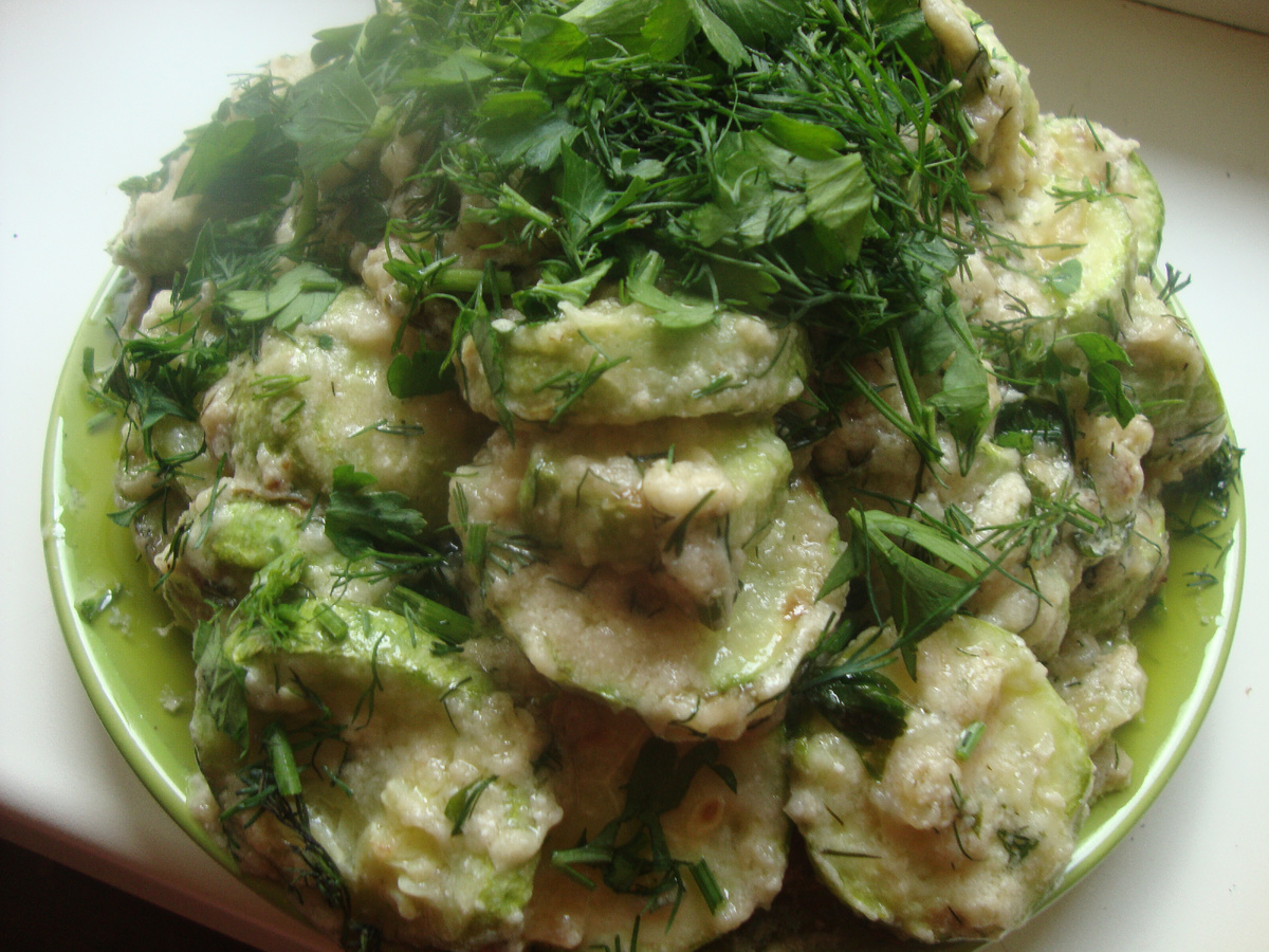 Рецепт: 4шт-кабачок, 180гр-сметаны 15%, 50 гр-сливочное масло, растительное масло-70гр,1шт-чеснок, укроп,петрушка, 0,5-соли, мука 3ст/ложки. Нарезать кабачки кружочками и слегка обжарить на подсолнечном масле до золотистой корочки (кабачки подсолить слегка до обваливания в муке). Отправить в небольшую кастрюлю. Убрать горячую сковороду с огня и влить сметану и + сливочное масло,чтобы растаяло и затем на огне помешивая,добавить 05ст/кипяченой волы,+укроп , петрушку,по вкусу соль. Затем +к кабачкам +чеснок очищенный ,зубчиков должно быть не меньше 12 шт. Тушить 7-8 минут .,не больше. Выложить на блюдо и украсить зеленью . Это очень вкусно и сытно. Чеснок в таком приготовление просто изюминка. Приятного аппетита и будем здоровы!