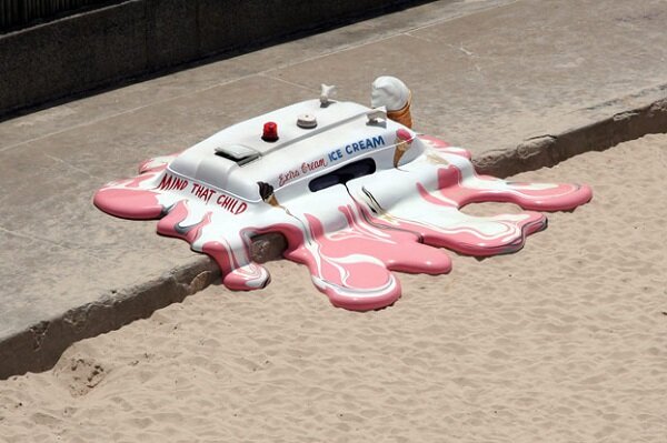 Отовариваясь в фургонах с мороженым, можно столкнуться практически с чем угодно. От танцев с шестом прямо на крыше «ларька на колесиках» и бара с алкогольными напитками до физиономии злобного клоуна. Этот обзор посвящен фургонам с мороженым, всемирно известным за счет креативного дизайна или уникального торгового предложения. Бронзовая инсталляция «расплавленный фургончик с мороженым» – дело рук канадского художника Ореста Кивена (Orest Keywan). По его словам, столь гротескный образ навеян впечатлениями от австралийской жары. Жюри ежегодного конкурса «Скульптура у моря» (Sculpture by the Sea) оценило «фургончик» в $ 30000. Работа и по сей день красуется на сиднейском пляже Tamarama beach. «Мороженный» фургон-амфибия HMS Flake 99 создан и введен в дело с разрешения британского правительства. Спуск мобильного «ларька» на воду был приурочен к Национальной неделе мороженого (National Ice Cream Week). Капитан «сладкого судна» – комик Дэйв Монфилд (Dave Mounfield) сначала прокатился по Темзе