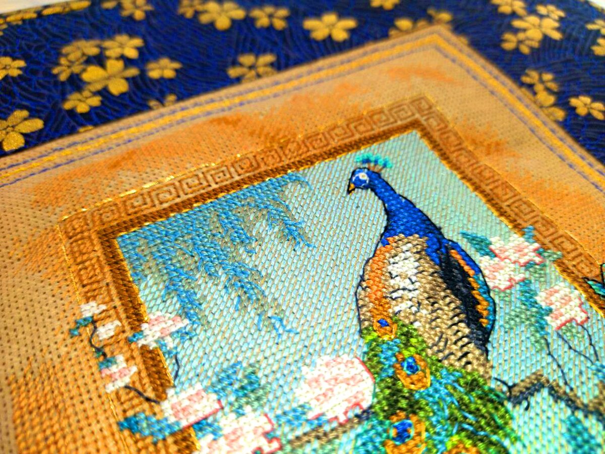 Павлины, говоришь… Да простят меня любители оформления своих вышитых работ в настоящие паспарту и багетные рамы. Я в своё время тоже отдавала оформлять свои «шедевры» именно в мастерские. Это красиво и украшает интерьер, без сомнений. Но в один прекрасный (или не очень) момент, одна из вышивок, упакованная таким образом, пошла пузырями. Я уже рассказывала эту историю в одной из статей. Если интересно – в конце будет на неё ссылка. И вот с той поры я экономлю свои нервы, деньги (потому как багетки дерут довольно ощутимую стоимость) и время. И совершенно спокойно оформляю свои работы сама. В ткань. Так, как это нравится мне. Никого не принуждаю поступать именно так, у каждого свой вкус и видение прекрасного. Просто расскажу, что сделала с очередной мини-вышивкой. В этот раз это прекрасный павлин от Дим. Старый и уже известный сюжет. Никаких изысков, не считая золотых нитей и бэка, который я, честно, не очень люблю. Но эти мелкие черточки придают завершенный вид вышивке, поэтому, скрепя с