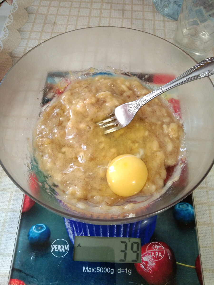 1. Спелый банан измельчила вилкой в глубокой тарелке или миске.