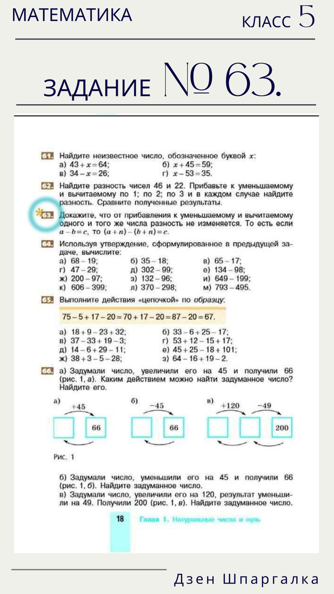 Здравствуй Дорогой Друг. Давно не виделись. Продолжаем. Предыдущий вариант решения задания № 63 направлен на умение рассуждать логически и использовать те правила (аксиомы), которые не требуют доказательств и являются верными. Аксиоматический метод (способ, не требующий доказывать те или иные правила) позволит в дальнейшем щёлкать задачки по геометрии на раз-два. Нижеописанный вариант подготавливает плацдарм практического навыка решения уравнений, где требуется найти значение неизвестного числа (переменной) или корня. Нам требуется решить уравнение (a + n ) - (b + n ) = c, в котором переменные a, b, c, n обратят данное уравнение в верное числовое равенство, при условии, что a - b = c. Как ты понимаешь, в нашем случае мы можем решить данное уравнение лишь гипотетически (условно), а именно: преобразовать выражение с неизвестными числами или упростить его, что означает сделать его проще или короче. Иными словами, нам можно применить к левой части равенства любые допустимые действия. За