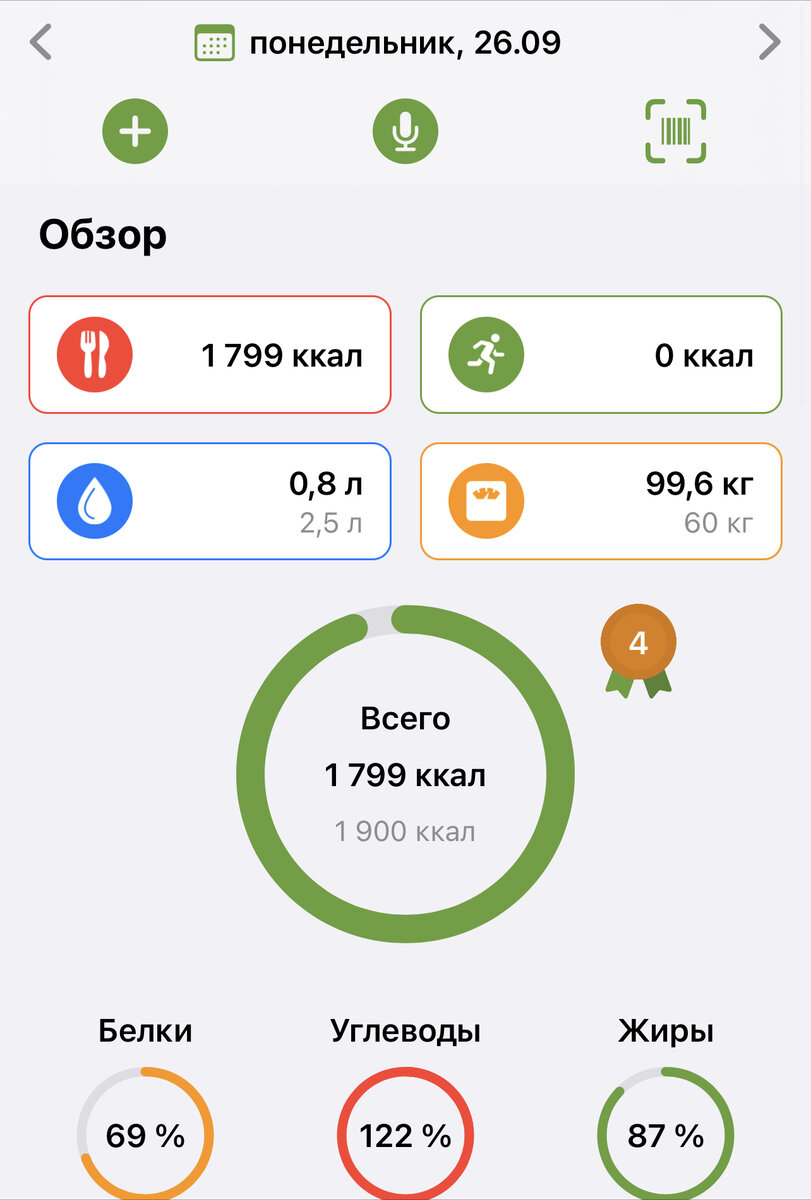 По калориям сегодня немного не добрала, но зато просели углеводы, опять не справилась я с этими бжу😭