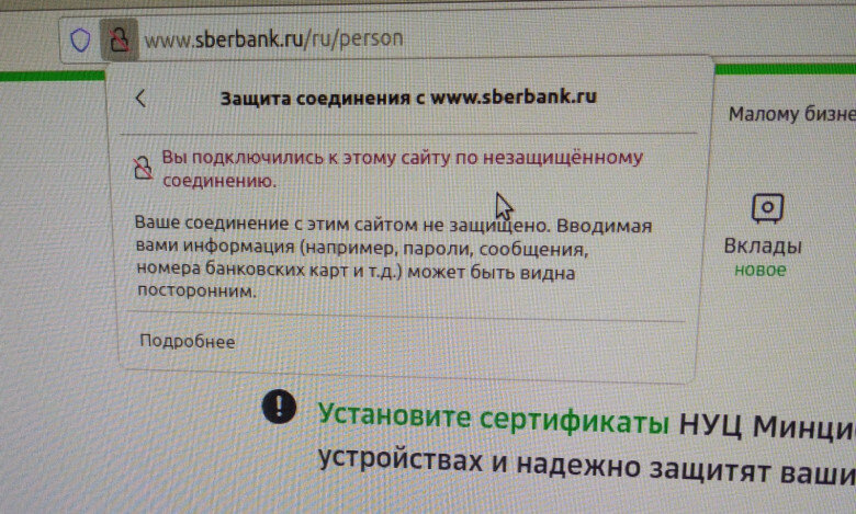Сайт был переведен на отечественные сертификаты безопасности и теперь при открытии официального сайта банка иностранные браузеры блокируют подключение как небезопасное. В "Яндекс браузере" и остальных русских браузерах сайт прекрасно открывается по защитному соединению https. Ранее, «Сбер» сообщил о переходе банка на российские сертификаты TSL 26 сентября. «Переход сайтов, рабочих ресурсов и систем „Сбера“ на отечественные TLS-сертификаты обеспечит нам независимость от зарубежных удостоверяющих центров и гарантирует безопасный доступ пользователям. Если сертификатов нет, рекомендуем установить их для доступа к онлайн-ресурсам „Сбера“. Это можно сделать двумя способами — либо скачать сертификаты на портале «Госуслуги», либо начать пользоваться браузером (»Яндекс Браузер" или «Атом»), который поддерживает сертификаты Минцифры", Сообщил «Сбер»