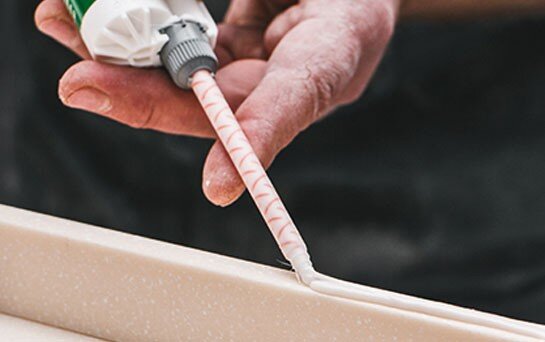 Акриловый камень — это материал, одним из важнейших свойств которого является бесшовное соединение. Чтобы соединение было прочным и действительно бесшовным, важно правильно подобрать клей. Для склейки акрилового камня используется двухкомпонентный клей: первый компонент — это акриловый полимер, второй — затвердитель. Как правило, поставщики акрилового камня рекомендуют для своего материала определенную марку клея, цветовая палитра которого соответствует цветовой палитре камня. Среднее время затвердевания клея — примерно 40-50 минут при температуре 17-21 °С. Дальнейшую работу, в том числе полировку и перемещение изделия, разрешается проводить примерно через час. Время затвердевания может изменяться в зависимости от температуры помещения, в котором ведутся работы: при низких температурах оно больше, при высоких — меньше. Рекомендации: 1. Если картридж холодный, подождите, пока он нагреется до комнатной температуры, и только после этого приступайте к работе. 2. За полчаса до использован
