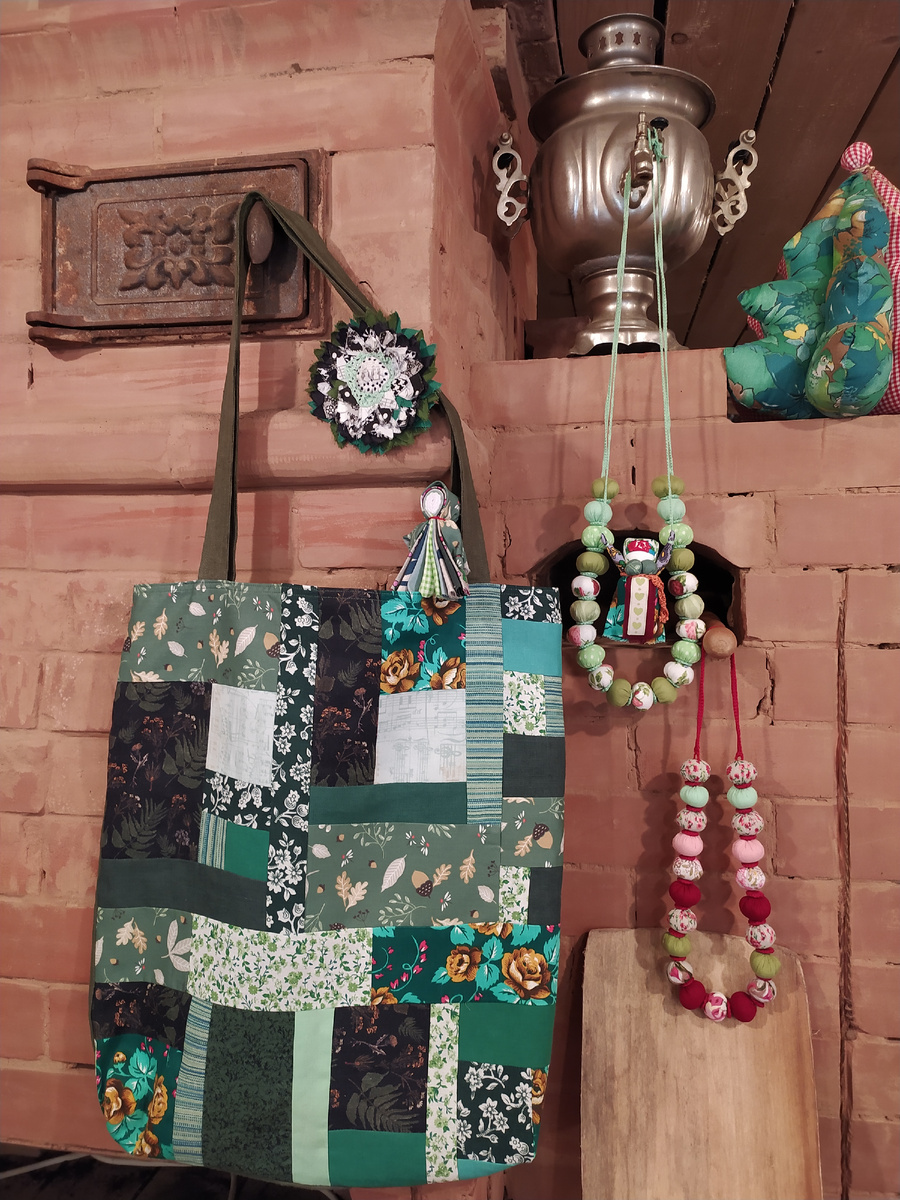 Признавайтесь, у кого печка выставочным стендом работала? Собрала я зелëное: сумку шопер, бусы лоскутные, брошь ляпочиху, куколку Северную берегиню, куколку-подвеску Благость, да и устроила выставку-пятиминутку. Ах, красиво. Ой, интересно-необычно! Сфотографировала и предлагаю: выбирайте чудесные вещи, в Кармашке счастья сшитые, хоть про одиночке, хоть комплектом в любом варианте.