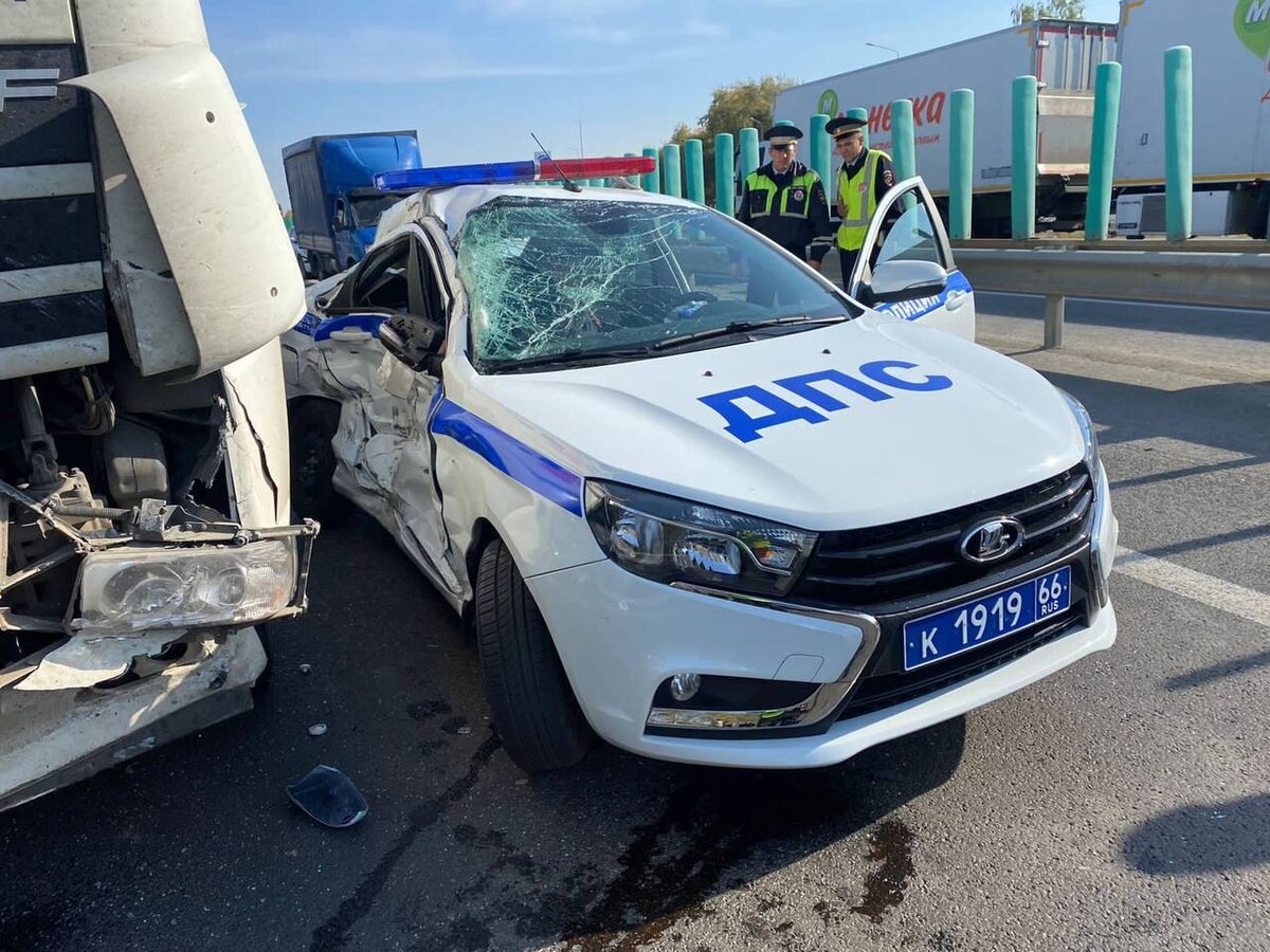 Напомним, авария произошла днём 22 сентября на дублере Сибирского тракта в районе Екатеринбурга. Наряд ГИБДД города Заречный преследовал лихача на Ниве и в какой-то момент патрульная Лада Веста столкнулась с большегрузом DAF, который ехал в попутном направлении.
