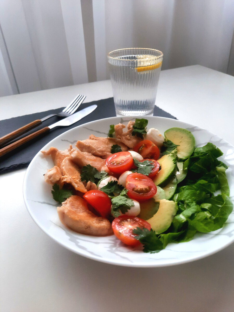 Рецепт легкого салата, источник белка, клетчатки и витаминов🌱 Ингредиенты: 4 листочка салата ромэна 4 -5 шариков моцареллы 1/2 спелого авокадо несколько томатов черри 40 - 50 г куриной грудки масло оливковое кинза или базилик Рецепт 1. Обжарить грудку ( слайсами ) до золотистой корочки на растительном масле. 2. Выложите смесь салата и моцареллу. 3. Между сыром расположите половинки черри. 4. Нарезать авокадо и выложить на тарелку. 5. Полить салат оливковым маслом и украсить кинзой или базиликом. Приятного аппетита💚