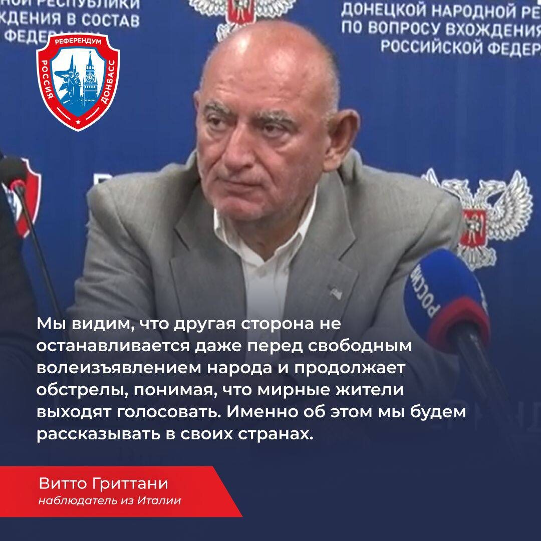 Всем здравствуйте! Итальянские наблюдатели, прибывшие в ДНР для инспекции хода референдума о присоединении к России, рассказали журналистам об увиденном и раскритиковали западные СМИ за ложь о событиях в Донбассе. По словам Вито Гриттани — основателя Международной дипломатической обсерватории и главы делегации, они убедились, что всё, о чём им рассказывали в Европе о СВО, — тотальная ложь. "Мы не видели никаких военных, стоящих там (на участках. — Прим. Лайфа) с оружием, заставляющих принимать участие в голосовании, ничего этого не было", — заявил делегат. В свою очередь, его коллега Джанфранко Вестутто, главный редактор издания Russia News, заявил, что СМИ на Западе приписывают референдумам "обстановку террора и запугивания", а сам выборный процесс называют фарсом. Журналист раскритиковал термин "аннексия", употребляемый медиа на его родине. В целом, по словам делегатов, их визит — доказательство прозрачности выборного процесса.