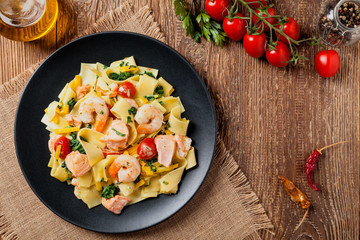 Если у вас есть креветки или остатки жареной курицы, предлагаю вам приготовить пасту, которая получится даже у начинающего кулинара. Ингредиенты: Приготовление: В сковороду добавить чайную ложку растительного масла (я использую оливковое и для аромата добавляю немного топленого или сливочного масла) и обжарить креветки буквально пару минут Снять креветки с огня и выложить их в емкость Обжариваем на среднем огне мелко нарезанный лук, чеснок и острый перец (при желании) в течение 3 минут, постоянно помешивая Добавить в сковороду томаты (нарезанные свежие помидоры или в собственном соку), перец, соль и итальянские травы. Уменьшите огонь и тушите пока жидкость немного не выпариться Отварите макароны до состояния al dente (если вам сложно самостоятельно определить состояние "недоваренности" макарон, то просто варите их на 1 минуту меньше, чем указано на пачке) Отваренные макароны переложить к соусу и перемешайте Выложите блюдо по тарелкам, добавьте креветки и тертый пармезан, украсьте листи