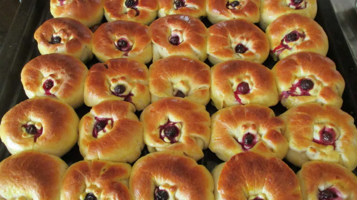 Ингредиенты: мука-700 г; молоко-350 мл; яйцо- 2 шт. + 1 желток- для смазывания верха булочек; масло сливочное- 150 г; сахар-3 столовые ложки; соль-1 чайная ложка; дрожжи быстродействующие- 10 г; разрыхлитель- 1/2 чайной ложки; уксус 6% 1 столовая ложка; любые ягоды ( можно замороженные)- 31 шт; растительное масло.