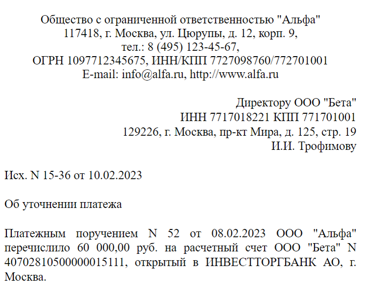 Образец письма об уточнении платежа в банк также можно бесплатно скачать в КонсультантПлюс по пробному доступу: