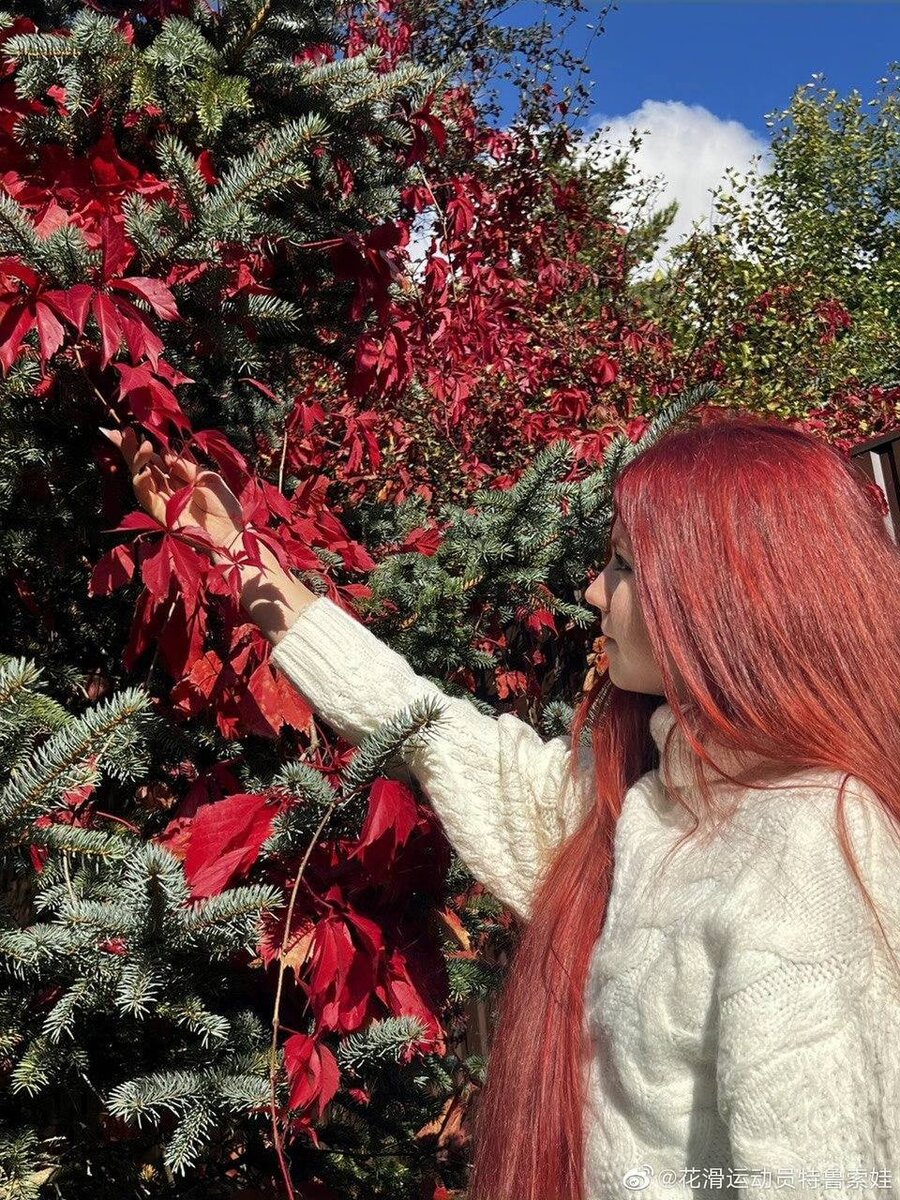 Какой сочной и красочной получилась новая фотосессия Александры Трусовой! Особо яркая фото, где Саша пристально смотрит в объектив в окружении зелёных ветвей ели.