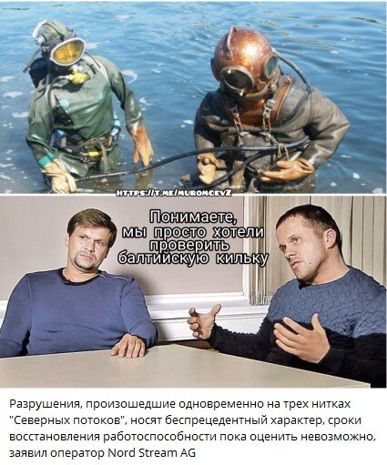 Что там наши неугомонные опять устроили? Трубопровод прогрызли? Да уж, придется Германии быть принципиальной! Ей просто ничего другого не останется, поймите меня правильно! Сроки восстановления работоспособности невозможно оценить...Весной оцените. Зима близко, вода ледяная, кто туда полезет? А летом восстановите. Вы же запад, у вас технологии! Неужели сложно приляпать заплатки? Это кому надо, нам, что ли? Нам и так тепло. В Питере вон тротуары собрались обогревать. И правильно. Что это за город такой, что голому человеку зимой на тротуаре поваляться нельзя? Непорядок. Тут не Европа все-таки! А цены опять растут... Потолок-то будете вводить? Обещают, обещают... 13 стран Евросоюза подписали письмо с просьбой, а вы молчите. Люди опасаются инфляции! Странно... С чего бы? Денег у них нет, что ли? Ну пусть напечатают, они же обещали. В чем проблема? А вы заметили - чем больше давление на Россию, тем меньше давление в трубах "Северного потока". Я бы на месте ребят задумалась о причнно-след