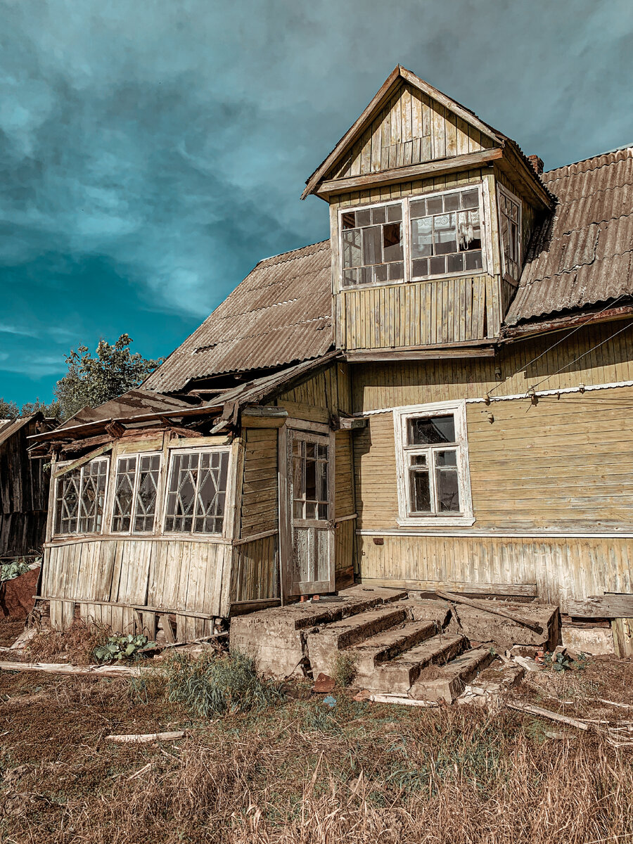 Этот заброшенный дом мы заметили еще с трассы, проезжая мимо деревни. Его красивые своды виднелись над крышами других домов. Сразу было понятно, что он заброшен, так как балкончик был изрядно покосившимся. Подойдя к дому ближе и осмотрев его снаружи, убеждаешься в этом окончательно: дом сильно накренился, окна выбиты кое-где, крыша на крыльце обвалилась. Выглядит этот дом аварийным. Заходим внутрь и видим разбросанные книги и мелкий мусор. Почти вся мебель на месте. Картины остались висеть на местах. Только вот, всё в неживом состоянии, нету жизни в этих вещах. Их больше никто не протирает от пыли, никто не ремонтирует если у дверцы отломалась ручка, и никто не ставит на комод вазу с садовыми цветами. Даже телевизор остался в этом доме. Да, он уже не работает, побитый, в пыли… стоит на полу, рядом с печкой, старой и ржавой, которую уже никто не затопит прохладным осенним вечером. Хоть дом и заброшен, но свет проникавший сквозь пыльные окна, создавал в нем какую-то магию. Пройдя да