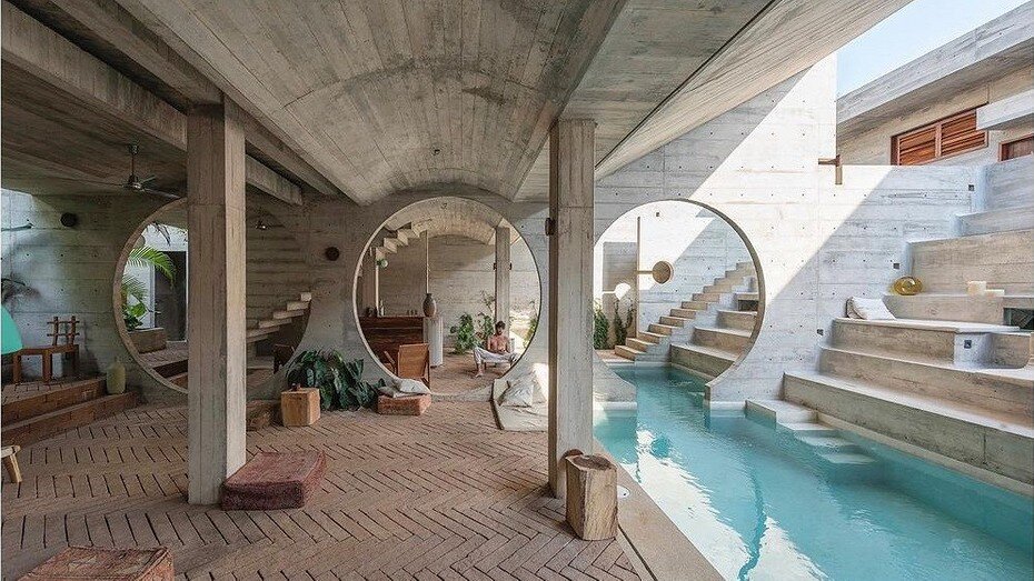 Бетонные стены воссоздают текстуру пещеры, а бассейн превратили в лагуну. Дополнили это местными растениями. В Мексике, на побережье Тихого океана, построили отель из бетона, напоминающий, по задумке авторов, пещеру. Его проект создал архитектор Людвиг Годфрой, сообщает Designboom. Гостиница полностью построена из бетона — монолитные стены оставили без отделки даже внутри комнат. По словам автора, так он хотел воссоздать атмосферу естественной пещеры. Дополняют эффект экзотические растения и круглые проходы. У такой идеи есть практическое применение. Цветы и кустарники помогают охлаждать помещение в течение всего дня. А просторные проходы обеспечивают хорошую вентиляцию. Шесть гостевых комнат находятся на первом этаже, а остальные три — на втором. Их расположение рассчитали для того, чтобы каждое помещение хорошо вентилировалось. Центральное место занимает бассейн, растянувшийся в длину всего дома. С одной стороны, он создает ощущение лагуны в пещере, а с другой — увлажняет и охлаждает