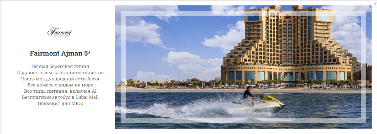 Fairmont Ajman 5* - один из самых популярных курортов Аджмана, открытый в 2015 году. Изначально это был канадский бренд Fairmont, сегодня - часть международной сети Accor. Архитектура здания напоминает песчаный замок, а люстра в лобби - рыболовную сеть из сотен кристаллов как память о рыболовстве – основном занятии местных жителей Аджмана. Отель подойдёт всем категориям гостей. Он расположен на первой береговой линии, с возможностью прогуляться по кафе и ресторанам поблизости. Отель располагает собственным 200-метровым песчаным пляжем. Важно отметить, что отель предлагает широкий спектр водных видов спорта. Номера. В отеле 252 номера, и важно отметить, что площадь самого маленького номера - 42м2. Наверное, именно поэтому детская кроватка (baby cot, деревянная) может быть размещена в любом номере, без дополнительной оплаты. Во всех номерах халат, тапочки, чайно-кофейный набор, гладильная доска, утюг, косметические принадлежности. Категории номеров отличаются друг от друга в первую оче
