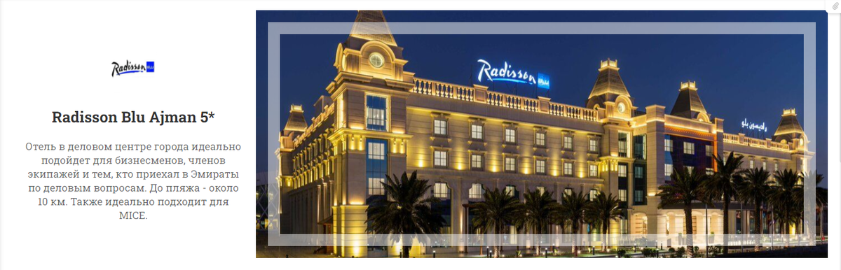Отель Radisson Blu Ajman 5* находится в центре города, в 10 км от набережной, и в 2 км от торгового центра City Centre Ajman Mall. Здание довольно интересной архитектуры, отличающееся от построек в арабском стиле, скорее напоминает греческий дворец. В отеле есть бесплатная парковка с услугами парковщика. На всей территории отеля действует бесплатный высокоскоростной Интернет. Отель был построен в 2017 году. Номера: В отеле 148 номеров 8 категорий от Standard до 2-Bedroom Suite. Важно отметить, что все номера достаточно просторные, площадь самого маленького - Standard Room - 36 кв.м. Для семей отель предлагает так называемые Family Stay Rooms - два стандартных номера, соединенные дверью. Во всех номерах гостям предлагаются тапочки и фен, а также кофеварка/чайник. Инфраструктура: В отеле есть бассейн 25 м, температуру в котором поддерживают на комфортных 25 градусах. Также в отеле работают 6 ресторанов, из которых самый популярный - ресторан итальянской кухни Filini. Если ваши гости ф