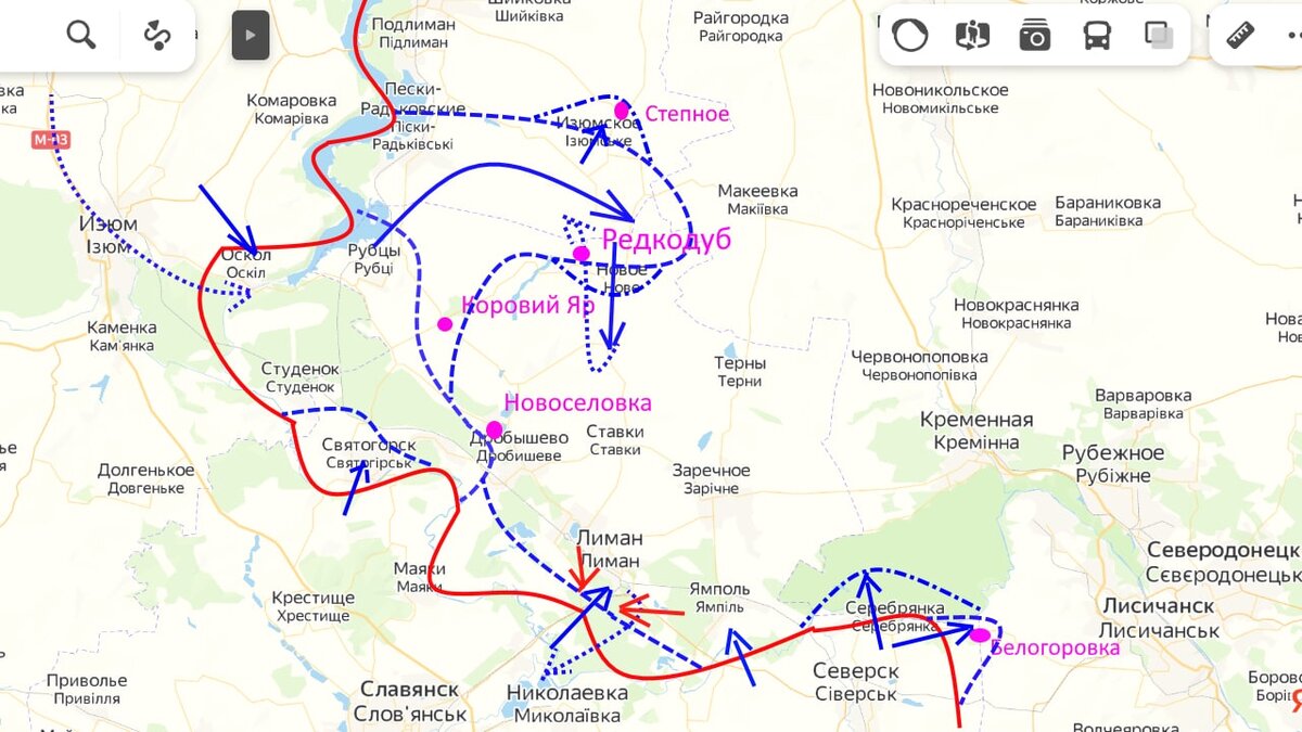 Обстановка около Красного Лимана продолжает обостряться. Вчера вечером ВСУ навели в районе н.п. Серебрянка несколько понтонных переправ через Северский Донец и начали закрепляться на плацдарме на северном его берегу. Цель очевидна, растянуть наши силы, как можно сильнее и добиться того, что их просто не хватит для прикрытия всех направлений, чтобы таким образом окончить бои за Лиман в свою пользу. Одновременно с этим идут атаки из «кишки» севернее города. По тем данным, что есть у меня утром противник силами разведргуппы занял н.п. Степное и пытается укрепиться в н.п. Новое, чтобы далее, опираясь на эти позиции нанести совместный удар с серебрянской группировкой и тем самым окружить Лиман, либо заставить, героически отбивающий все его атаки гарнизон города отступить на территорию ЛНР в районе Кременной. То есть кульминация боев здесь пока не наступила, опасность для Лимана не снята, а наоборот усиливается.