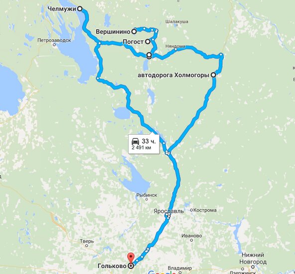 Каргополь - Саунино (Кипрово) (Церковь Иоанна Златоуста) - Ошевенское (Ширяиха, Погост, Большой Холуй ) - Вершинино.