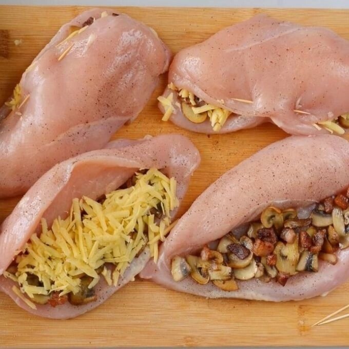 ФАРШИРОВАННЫЕ КУРИНЫЕ ГРУДКИ Измените свой обычный обед или ужин из курицы с помощью этого простого и вкусного рецепта. Ингредиенты: Куриная грудка - 4 шт. Свежие шампиньоны - 240 гр. Бекон - 240 гр. Сыр голландский - 240 гр. Оливковое масло - 1 ч. л. Соль - 4 щепотки Чёрный молотый перец - 4 щепотки Для медово-горчичного соуса: Майонез - 1/4 стакана Сметана 15% - 1 ст. л. Мёд - 3 ст. л. Горчица - 1.5 ст. л. Паприка - 1/8 ч. л. Для подачи: Петрушка - 4 веточки Приготовление: 1.В небольшой миске смешайте для соуса майонез, сметану, мед, дижонскую горчицу и паприку. 2.Нарежьте 240 грамм бекона на мелкие кусочки. 3.Обжарьте в большой сковороде, часто помешивая, до готовности. Удалите приготовленный бекон и слейте жир, оставив 1 чайную ложку жира в сковороде. 4.Шампиньоны очистите, промойте, обсушите на кухонном полотенце и нарежьте на пластины. 5.Добавьте нарезанные грибы в ту же сковороду и готовьте, пока они не подрумянятся. Приправьте солью и перцем, снимите со сковороды и отложи