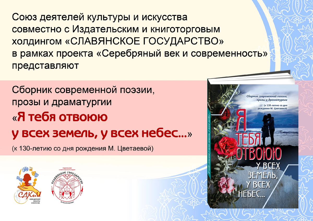 К 130-летию со дня рождения М. Цветаевой Сайты slav-gos.ru, sdkii.ru Внимание! Приём заявок продлён до 15 октября! Общие положения Книга выйдет форматом А5, объёмом до 150 страниц, в твёрдой цветной обложке, общим тиражом до 1000 экземпляров. Изданию присваиваются все обязательные коды: УДК, ББК, ISBN, авторский знак. Планируемые места реализации продукции: • магазин «Мастера искусства»; • книжные сети и отдельные магазины издательств-партнёров; • партнёры «СЛАВЯНСКОГО ГОСУДАРСТВА» и СДКиИ; • интернет-магазины; • библиотеки России; • музей «Серебряного века»; • различные литературные общества. Сборник будет представлен на всевозможных международных книжных выставках-ярмарках и конкурсах, выдвинут на соискание престижных премий. В Москве, Санкт-Петербурге и других городах планируется проведение презентации книги, где авторы, произведения которых войдут в состав сборника, будут иметь возможность выступить. Авторы, чьи произведения будут опубликованы в сборни