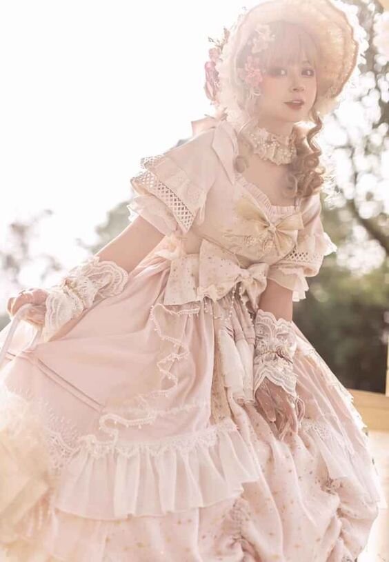 В светло-розовом платье, с перчатками из тонкого кружева, и тяжелой полупрозрачной вуали по всему периметру отделанную толстым кружевом, в старомодной шляпке, с искусственными цветами не только на шляпке, но и в локонах. Украшение на шее так же было из шелковых цветов.
