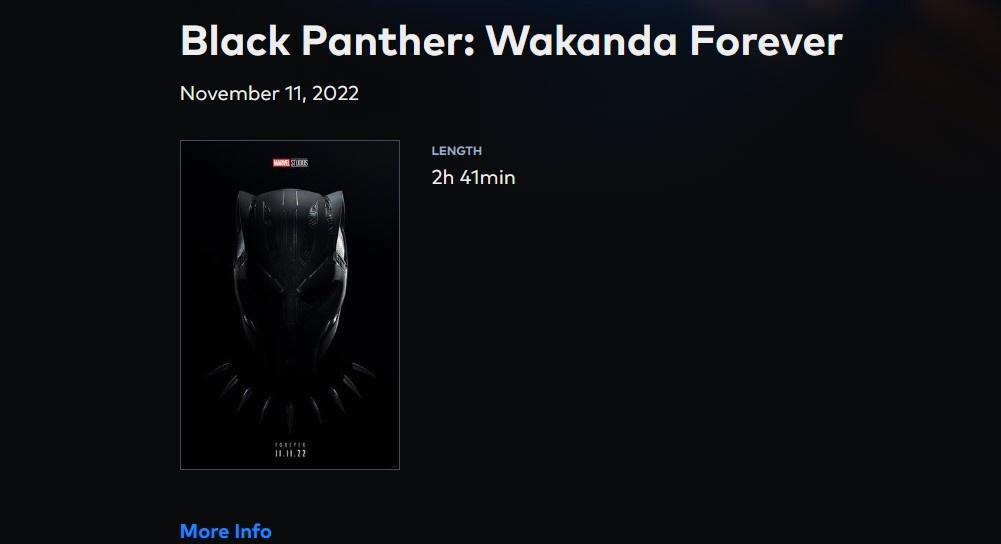 Похоже, фильм "Черная пантера: Ваканда навсегда" станет одним из самых продолжительных в истории картин Marvel Studios. Согласно канадской сети кинотеатров Cineplex, лента будет идти 2 часа и 41 минуту.