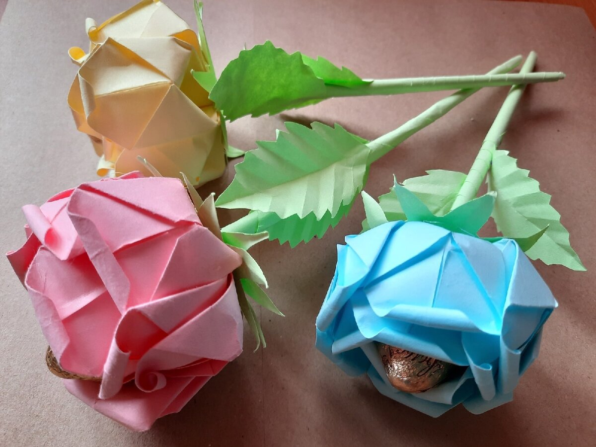 Близится 5 октября! И опять возникает этот вопрос. Подарок классному руководителю, как правило, выбирается тщательно и дарится от коллектива. А что делать, если вашему ребёнку хочется сделать небольшой индивидуальный подарок в знак благодарности...Читайте этот мастер-класс. Возможно, это то, что вам надо! Симпатичные розочки-цветочки с конфеткой внутри! Сделать такие могут Легко даже дети! Интересно, что конфетку даже не пришлось приклеивать ( хотя я сперва и планировала), она и так неплохо держится. Чтобы достать конфетку, не нужно ломать цветочек, что тоже важно! На цветок потребуется всего лишь лист офисной бумаги формата А4 и еще зеленая бумага (около половины листа) на стебель, листья и чашелистики. Лист для цветка делим сначала пополам. У сложенного пополам листа отгибаем третью часть наверх. И третью часть опускаем вниз. Разворачиваем! Лист разделен на 6 прямоугольников. Если они будут немного неравны, ничего страшного. Лепестки могут отличаться друг от друга, как это и бывает