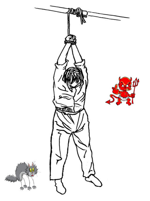 Пока заложники допивали чай и готовились к дороге, Виктор оттащил в сарай парней и подвесил к балке за ноги. Последним он втащил Петра. Подвесив его за руки, привёл в чувство.