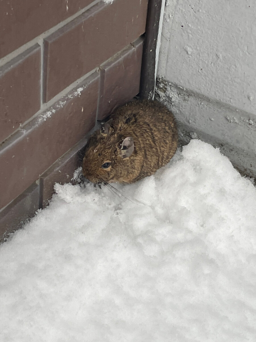 Однажды мы всей семьей отправились в гости к моим родителям. Декабрь, снег, промозгло. Живут дедушка и бабушка в обыкновенном пятиэтажном доме, в Ленинградской области. Возвращаясь с очередной прогулки мы с детьми подошли к нашему подъезду. Я смотрю, сидит крыса. Подходим к ней ближе-она не убегает. Я думаю: «Вот наглые крысы какие стали. Ничего не боятся!» Дети увидели: «Ой какая мышка!», руки к ней тянут. А крыса ещё и к ним собралась в руки идти! Я заверещала и запретила детям трогать животное. И думаю себе дальше: «Странная все же крыса. Что-то тут не так». Решила перепроверить свои ощущения. Сфотографировала грузунчика и отправила фото знакомому ветеринару. Получила ответ: «Похоже на шиншиллу, но по фото не очень понятно». Ну что ж, шиншиллу надо спасать. Взяли коробку, одели на деда варежки-для безопасности. У детей восторг-идём на охоту! Мышка все на том же месте, сидит на снегу, сжалась в комок. Взяли ее, посадили в коробку. Грызун не сопротивлялся. Отправились к ветеринару н