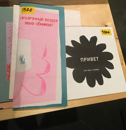 Арт-маркет в Граунд Солянке может оказаться поистине классной и доступной площадкой для монетизации своего творчества. Здесь можно встретить как уже более-менее состоявшихся творческих людей, так и инициативных новичков. В первом случае, бесспорно, фигурировали стенды культурных институций, таких как Фонда Ruarts и Центра Вознесенского, с книгами об искусстве. Стоит и упомянуть представленных в Граунд Зин Магазине Варвару Пражку, создающую жизненные, концептуальные иллюстрации и полуабстрактные пейзажи в темных тонах, и Катю Стельмах, работающую с гумойлом – особым видом фотопечати – и подарившую зрителям на маркете изысканно-декадентные образы в цианотипии, созданные в соавторстве в проекте ST_22_. Во втором же случае, буквально рядом со стендом Варвары, удалось приметить профеминистскую писательницу Алену Романенкову (выступившую под брендом VIVart Books), делающую экзистенциальные коллажи для собственных книг с рассказами, в которых можно даже послушать песни по QR-кодам. Примечател