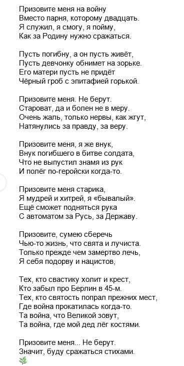 В моем окружении есть немало немолодых людей, которые не просто глубоко переживают за страну в нынешнее лихолетье, но и готовы защищать ее с оружием в руках. Большинство из них не имеют реального опыта боевых действий, за их плечами либо срочная служба, либо специальности, полученные на военных кафедрах еще в СССР. Но все равно, несмотря на годы, эти люди готовы защищать Родину. Переживают только, что по возрасту «уже не проходят». Именно об этом написал в своем стихотворении Александр Оленичев. Глубокое стихотворение! В нем есть и жертвенность, и стремление послужить своим, взять на себя боль и горе товарищей. А есть и другие люди, относительно молодые, которые сейчас позорно бегут из своей страны. Недальновидные! Неужели они думают, что этим самым спасутся? Неужели после той «кровавой бани», которую наши противники готовят России, они надеются «остаться в живых» и поселиться где-то в уютном домике на берегу моря? Конечно, нет. Сметет их «ветер истории». Недаром древние воины так заб