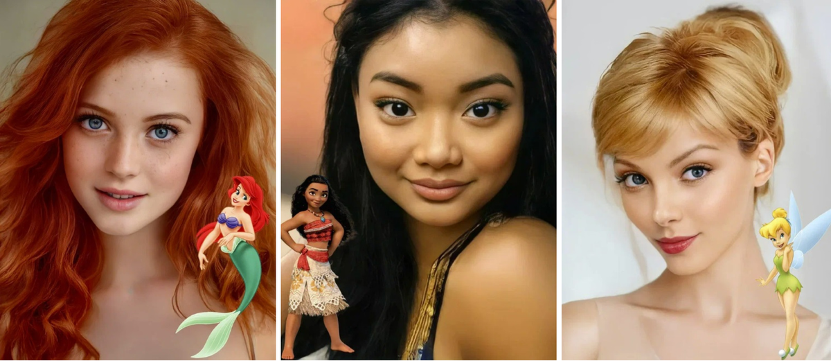 И снова искусственный интеллект создает пугающе реалистичные портреты: посмотри, как принцессы Диснея выглядели, будь они реальными девушками. Они все потрясающие и очень красивые! Смотри фото и голосуй — кто из принцесс тебе понравился больше всего. А кто максимально похож на свой прототип из мультфильма! Белль, «Красавица и Чудовище» Мерида, «Храбрая сердцем» Мулан, «Мулан» Золушка, «Золушка» Тиана, «Принцесса и лягушка» Жасмин, «Аладдин» Тинкербелл aka фея Динь-динь , «Питер Пэн» Рапунцель, «Рапунцель: Запутанная история» Покахонтас, «Покахонтас» Дочь вождя Моана, «Моана» Белоснежка «Белоснежка и семь гномов» Принцесса Анна «Холодное сердце» Ариэль, «Русалочка»