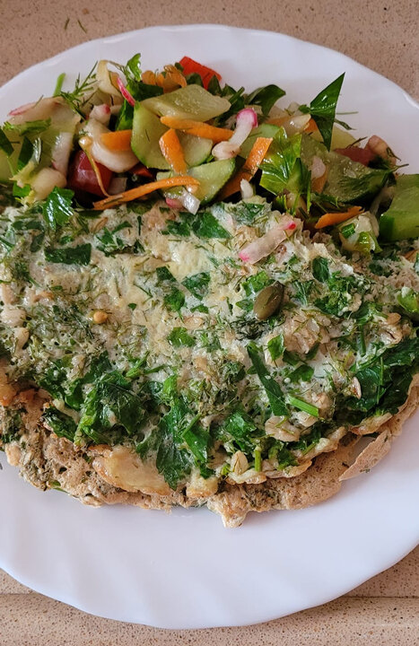✓ Зелень – 30 г. Смешала всё, дала крупе и отрубям минут 15, чтобы набухнуть, и выложила на разогретую сковороду с чайной ложкой подсолнечного масла. До готовности доводила под крышкой, на небольшом «огне», не переворачивала. И салат, почти летний, пока ещё с полезными, естественными овощами, заправленный оливковым маслом, со щепоткой соли и молотого перца. (примерно100 г) Больше общения и рецептов - в группе "Рецепты для диабетиков" в ВКонтакте! Рецепт на странице Автор рецепта – Oksana Derevianko