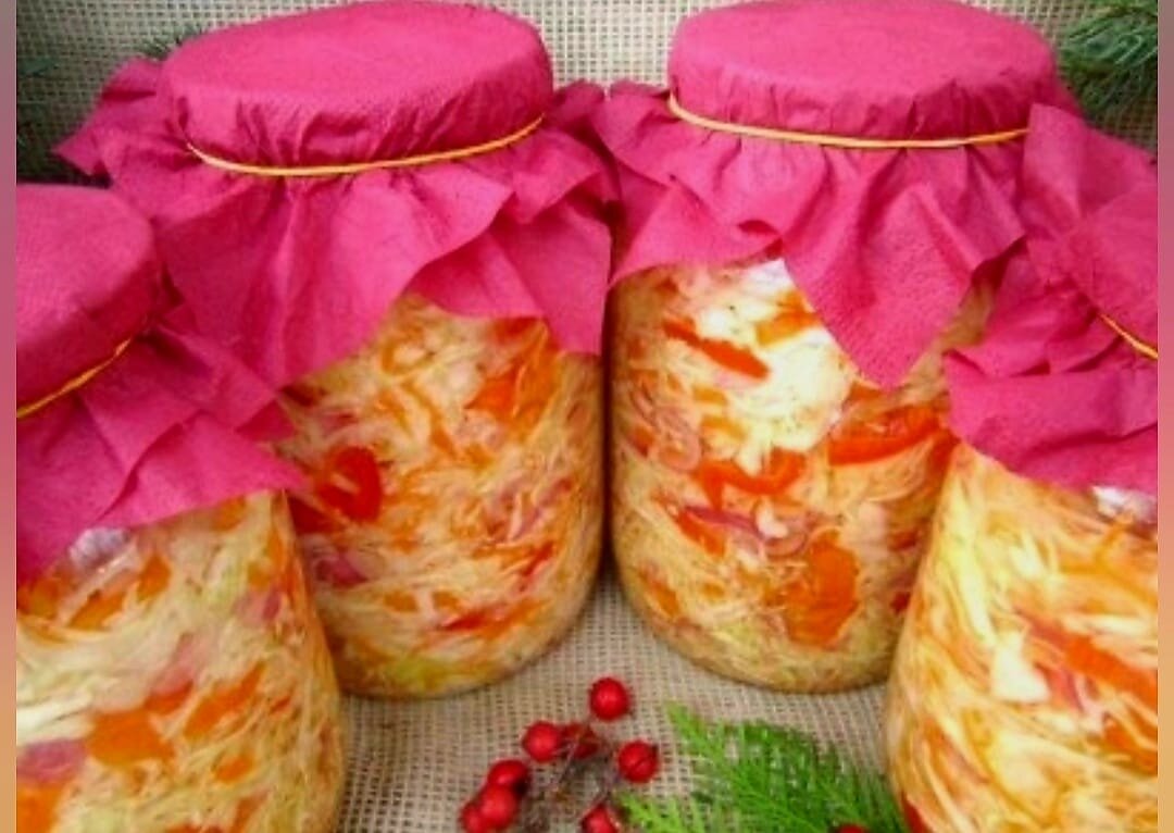 Капуста "Закусочная" Ингредиенты: на 2 ,5 кг капусты Перец болгарский 3-5 шт Морковь 2-3 шт Лук репчатый 3-4 шт, можно красный салатный Соль 40-45гр Сахар 4-5 ст.л Уксус 9% 100мл 200 мл растительное масло Выход 4л В большую миску доб резанную капусту,тонкими полукольцами лук,тертую морковь и нарезанный соломкой болгарский перец. Добавим соль и сахар, всё перемешиваем руками. Далее вливаем Уксус и растительное масло, перемешиваем. Оставим на кухонном столе на 1 час. Далее раскладывать по банкам,закрываем пластиковыми крышками и храним в холодильнике хоть до весны .Употреблять можно сразу,но лучше дать настояться 2-3 дня. Приятного аппетита!