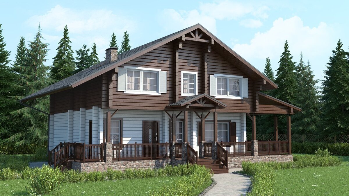 Рассмотрим планировку. На первом этаже расположены: На втором этаже находятся: Снаружи дом будет радовать своих жильцов гармоничным и уютным видом. Сама атмосфера в шале способствует отдыху, и дает возможность восстановить силы. Еще одним его преимуществом является просторная терраса с навесом, площадью 34 м2, где можно отдыхать с семьей или друзьями теплыми летними вечерами. Такой дом мы готовы построить за 5 месяцев, включая изготовление домокомплекта. Понравился дом? Заполните форму по ссылке, мы свяжемся с Вами и вышлем презентацию проекта.