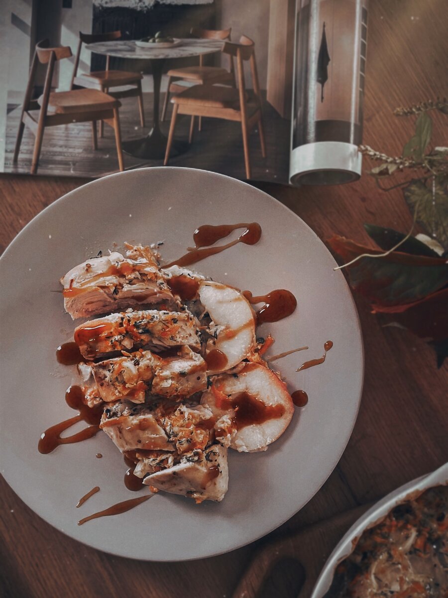 Итак, для приготовления вкусного сочного филе нам понадобится: Ингредиенты: ° Куриное филе - 4 шт. ° Соль - по вкусу ° Перец - по вкусу ° Горчица - 4 ст.л. ° Луковица - 1 шт. ° Морковь - 1 шт. ° Сыр - 100 гр. ° Укроп - пучок ° Сметана - 100 гр. ° Растительное масло - 2 ст.л. ° Яблоко - 2 шт. Приготовление: Куриное филе солим, перчим и обмазываем горчицей. Откладываем в миску мариноваться на 15 минут. Для начинки соединяем в миске нарезанный лук, натертую на терке морковь и натертый твёрдый сыр, крошим зелень. Добавляем соль, перец. Заправляем сметаной. Нарезаем кружочками яблоки. Выкладываем их в смазанную растительным маслом форму. Сверху помещаем грудки. Это сделает мясо сочным. В каждой грудке делаем продольный надрез, заполняем его начинкой. Запекаем 30-35 минут в разогретой духовке при температуре 170°. Готово!