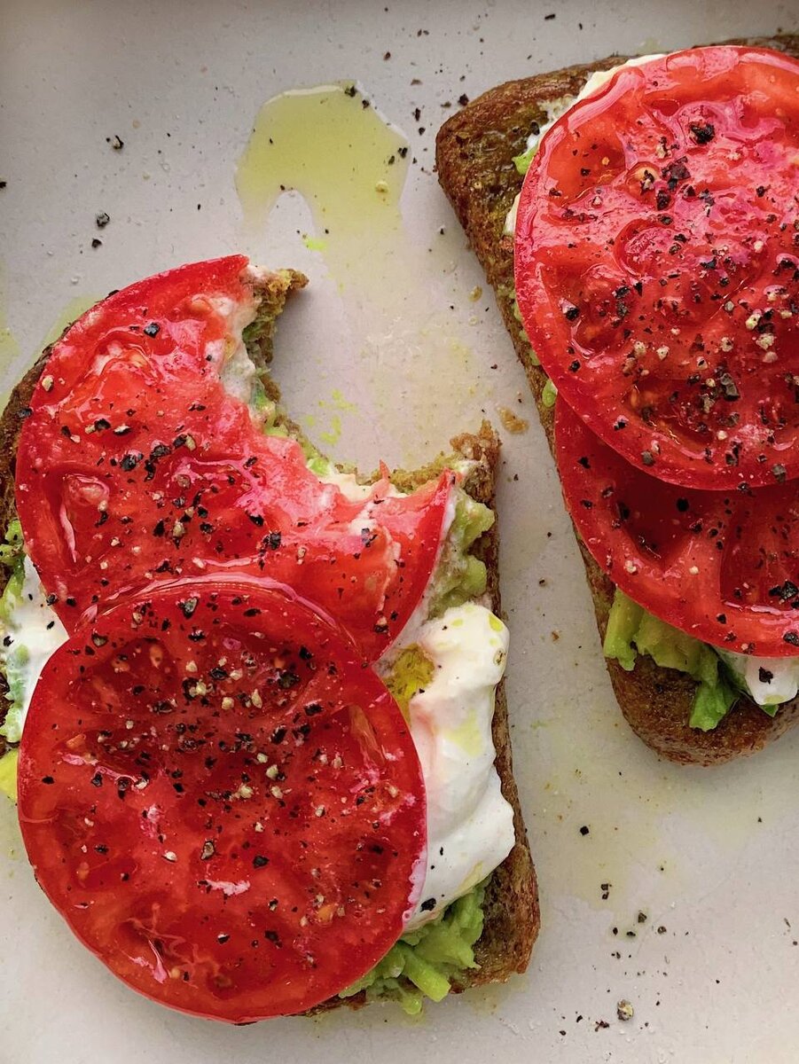 тосты со страчателлой, авокадо, помидорами и оливковым маслом;