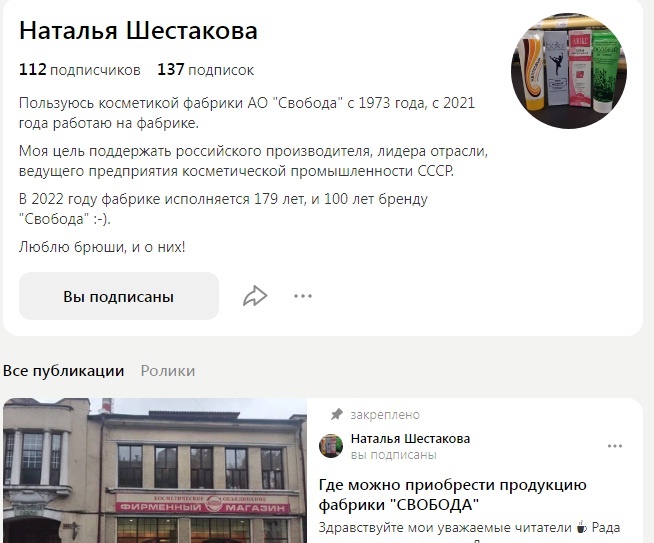 Ещё один именной канал, Наталья Шестакова. При этом канал примерно пополам о продукции фабрики Свобода и серебряных украшениях. Кстати в рамках импортозамещения к продукции фабрики стоит присмотреться. Но начну с главного, на мой взгляд. Почему канал о фабрике, хоть и именной. Основная мысль и выдержка от Натальи: "У нас хотят снести здания, которым более 100 лет. Фабрика "Свобода" до конца 2022 года ОБЯЗАНА переехать..., а на этом месте "новые власти" построят "муравейник" (студии - однушки). Вот поэтому, мне пришлось..... , тут тусить.... Вечный вопрос и ответ: " а Баба-Яга против". Да, против сноса исторических и не только исторических зданий АО "Свобода". История тянется с 1843 года с Хамовников, а 1899 году и были построены новые здания (не одно) фабрики Товарищества Ралле и Ко, а второе здание, где был фонтан, было построено в 1914 году." Но кроме этого поста, больше никаких призывов и обращений на канале я не заметил. Зато, посмотрите какая замечательная продукция, из свежих пуб