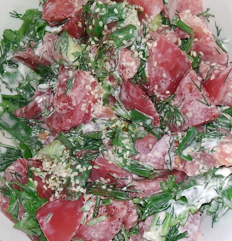 Ингредиенты: Помидоры Лук репчатый Укроп Кинза Петрушка Лук зелёный Листья салата Майонез Горчичное масло Соль Молотый перец Начинаем готовить: Предварительно приготовим ёмкость. Это может быть салатница или глубокая тарелка для первых блюд. Берём репчатый лук. Лук должен быть среднего или небольшого размера. Очищаем и разрезаем на две части. Одну часть лука начинаем тонко шинковать, другую нарезаем небольшим размером. Лук нарезан, добавляем к помидорам.