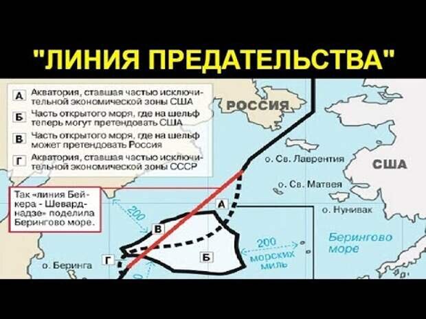 5. Переговоры продолжались. Вдруг в 1990-м Шеварднадзе с Бейкером утвердили очень странную линию. По которой амеры на временной основе получили почти 80% (-Восемьдесят, Карл!) акватории Берингова моря. Плюс континентальный шельф с огромными запасами ресурсов. Эту линию потом назвали «Линия предательства».