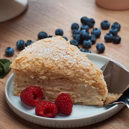 Способ приготовления Раскатайте слоеное тесто комнатной температуры, предварительно посыпав стол мукой. Выпекайте каждый корж 7 минут в предварительно разогретой духовке на 200-210°C. Готовые коржи обрежьте под форму для торта, а из остатков сделайте мелкую крошку, чтобы украсить его сверху. Для крема разогрейте молоко в сотейнике на медленном огне, добавив в него ванильный сахар Dr. Oetker. Перемешивать не обязательно, он и так растворится. Пока молоко подходит, отделите 15 желтков и взбейте их до состояния густой пены. Плавно введите сахар, а затем муку, постепенно увеличивая скорость, чтобы не было комков. Добавьте полученную смесь в кипящее молоко и варите до однородной массы. А затем остудите, отправив в холодильник на час. Взбейте холодные сливки. Аккуратно перемешивая, соедините с остывшей массой. Смажьте коржи кремом и не бойтесь, если какие-то из них поломаются в процессе укладки в форму. Они все равно пропитаются и опять станут цельными. Сверху посыпьте торт раскрошенными ко