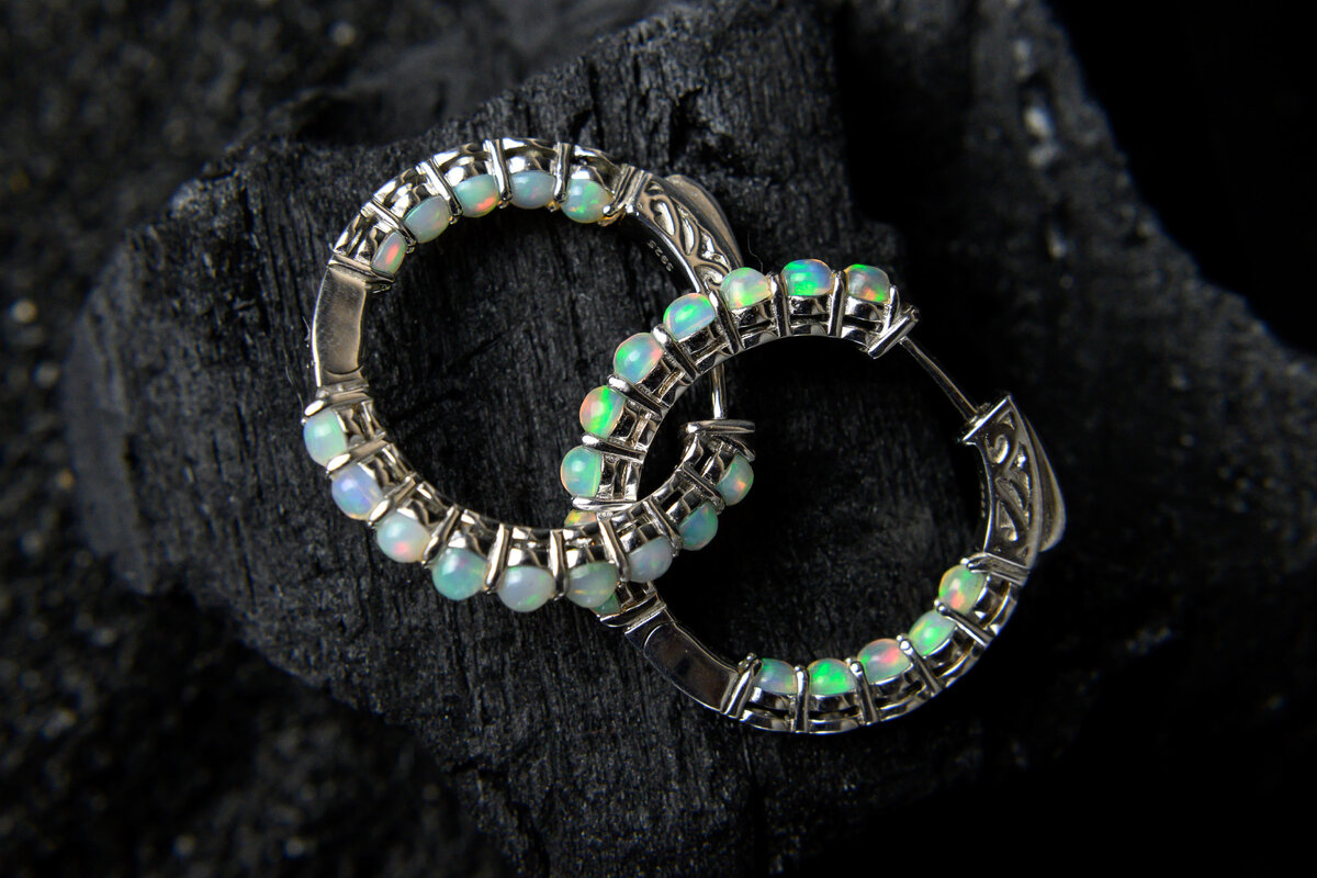 Общий вес всех опалов: 2,3 карата. Застежки очень качественные и крепкие. Открываются легким нажатием на выступающую часть серьги: Закрываются с легким характерным щелчком. Материал – стерлинговое серебро с родиевым покрытием, проба имеется: Сами серьги-кольца не очень большие: 25*26 мм. Общий вес: 6,9 грамм.