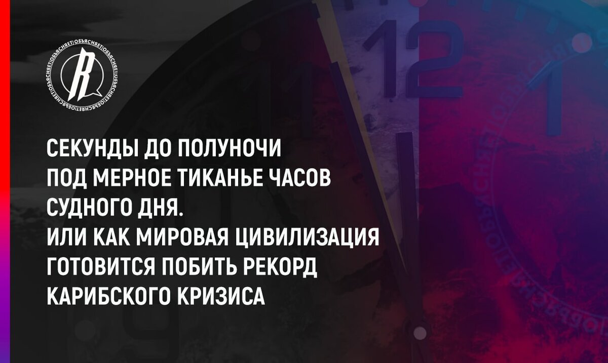Мировая цивилизация готовится побить рекорд Карибского кризиса. «Большая игра 2.0» по пересмотру текущего миропорядка медленно, но верно подползает к своей кульминационной фазе. Со времен противостояния первого секретаря ЦК КПСС Никиты Хрущева и 35-го президента США Джона Кеннеди мир еще никогда не был так близок к глобальному ядерному конфликту. Часы Судного дня Часы Судного дня – проект, начатый в 1947 году создателями первой американской атомной бомбы. Каждый год в США публикуется изображение часов, показывающих без нескольких минут полночь. Время, оставшееся до полуночи, символизирует напряженность международной обстановки. Сама полночь – момент начала глобальной ядерной войны. Вероятность применения стратегического оружия ничтожно мала, но в противостояниях современности психологическая и информационная составляющая играет главенствующую роль. События последних двух суток однозначно говорят, что Лондон и Вашингтон приняли решения по дальнейшей эскалации мирового хаоса.