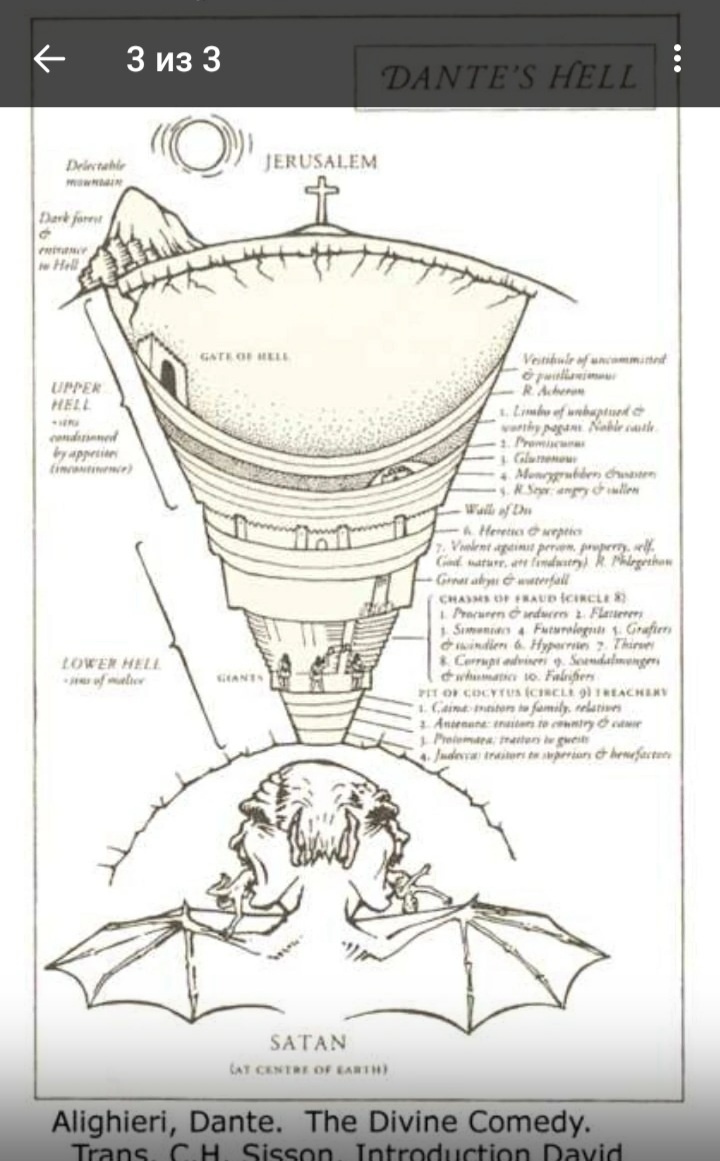 Путешествие, туда, куда не нужен БИЛЕТ...НО есть Люди которые, проходят это Путешествие, "туда-обратно"... ДАНТЕ АЛИГЬЕРИ : "БОЖЕСТВЕННАЯ КОМЕДИЯ : АД👿. ЧИСТИЛИЩЕ☠. РАЙ😇. Во вводной песне Данте рассказывает, как он, достигши середины жизненного пути, заблудился однажды в дремучем лесу и как поэт Вергилий, избавив его от трёх диких зверей, загораживавших ему путь, предложил Данте совершить странствие по загробному миру. Узнав, что Вергилий послан Беатриче (возлюбленной Данте), Данте не без трепета отдается руководству поэта. Пройдя преддверие ада, населённое душами нерешительных людей, они вступают в первый круг ада, так называемый лимб (А., IV, 25-151), где пребывают души тех, кто не смог познать «истинного Бога». Здесь Данте видит выдающихся представителей античной культуры — Аристотеля, Еврипида, Юлия Цезаря и др. Следующий круг (ад имеет вид колоссальной воронки, состоящей из концентрических кругов, узкий конец которой упирается в центр земли) заполнен душами людей, некогда предав